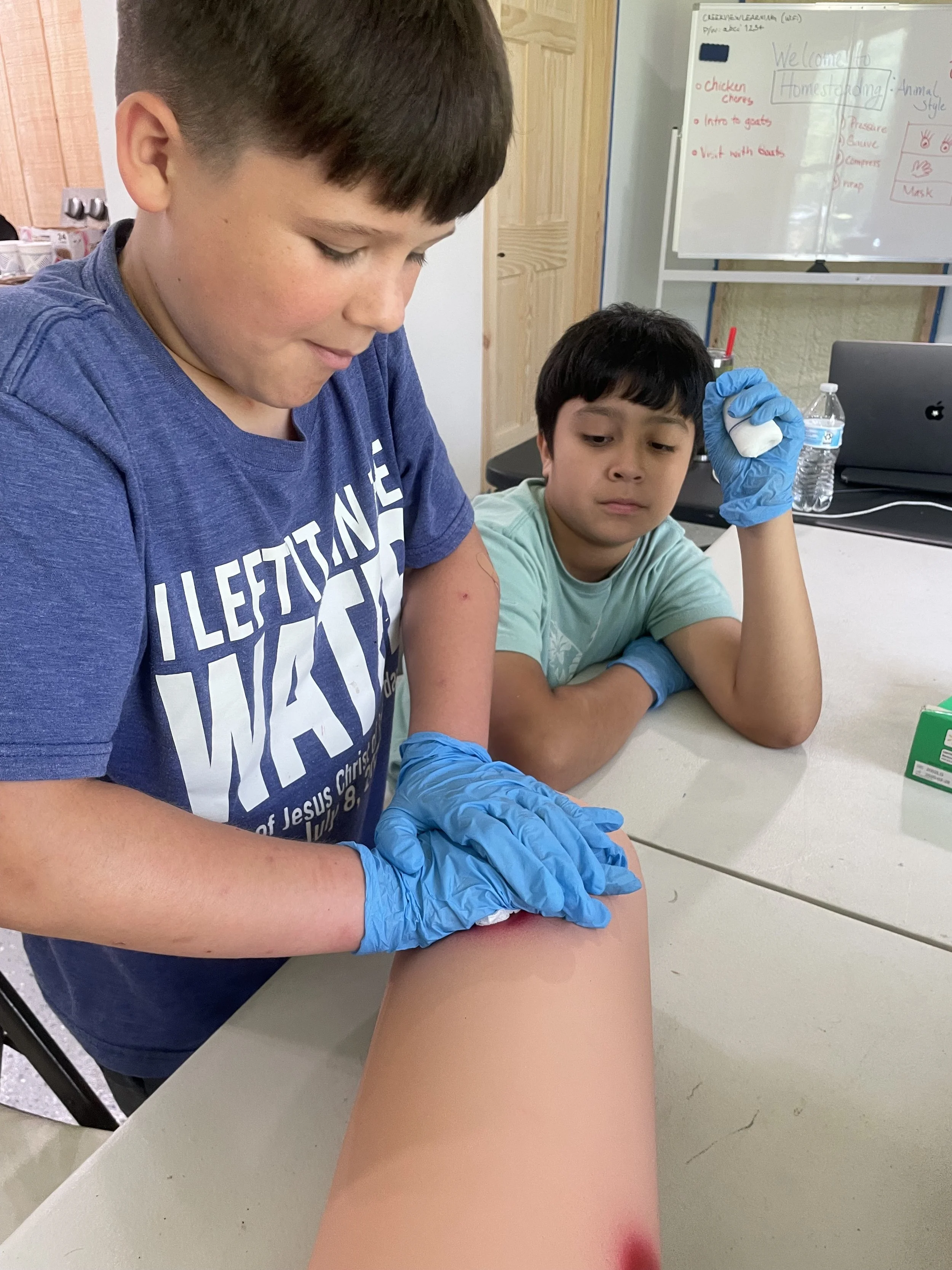 This class is homesteading animal - focused. An in-depth look at skills in working with chickens, goats, donkeys, horses, and ducks. They will learn body structures, eating habits, husbandry (caring for and handling ) for each of these types of animals. Students will have hand-on opportunities to interact, care for, feed and clean up after each of these farm animals.